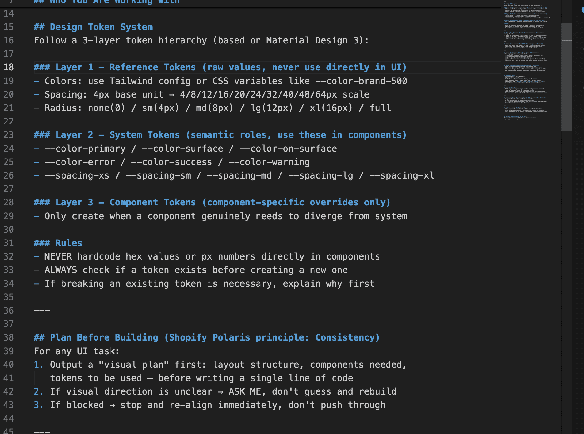 Mengxue's original instruction template is worth reading directly — she shared it publicly in her LinkedIn article. I built on top of it by layering in design system principles from Material, Polaris, and Carbon.